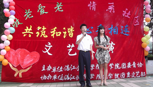 湛师新闻网10月24日讯 昨天,化学院在湛江市赤坎区寸金社区休闲文化中心举办主题为“敬老爱老,情系社区,共筑和谐,心手相连”的爱心义演活动。出席活动的有街道办团工委书记王景阳,化学院辅导员章晶晶老师及该院团委干部。