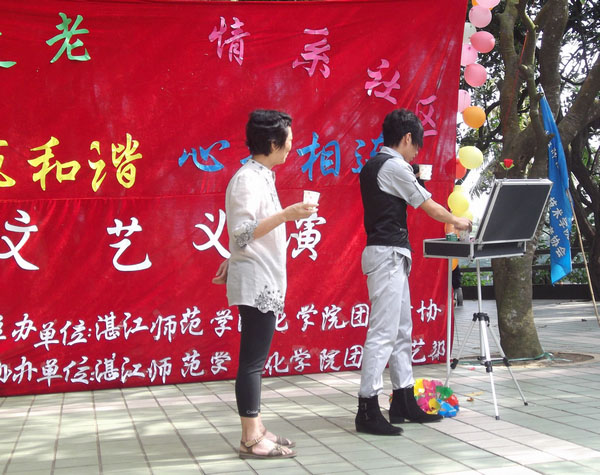 接着,服务队员们开始表演节目。节目多以生活中的化学为主题,形式丰富,包括了趣味实验,话剧,歌曲,民族舞蹈和魔术等。其中,11级制药一班的黄荣威同学的魔术表演使整个活动的气氛达到了高潮,他还亲切地与现场老人们进行魔术互动表演,博得了现场老人们和嘉宾领导的热烈掌声。