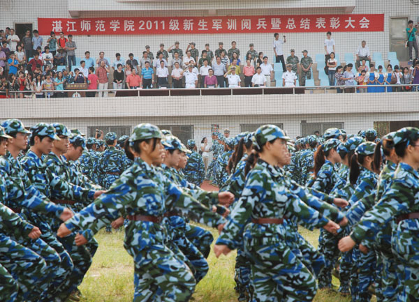 随后进行的是总结表彰。91487部队政治委员傅志新同志宣读了《湛江师范学院2011级新生军训(第一批)先进集体名单》。其中音乐学院2011级音乐2班和商学院2011级财务会计教育2班获得一等奖,教育科学学院2011级小数班等4个班获得二等奖,法政学院2011级社会工作班等6个班获得三等奖。学校领导和部队首长为获奖班集体颁奖,并表示祝贺。