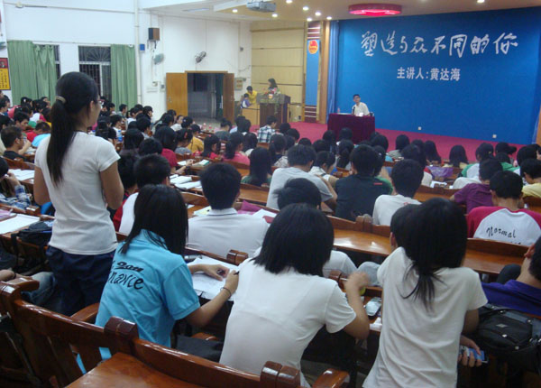 讲座伊始,黄处长向在座的同学提出了三个问题:自己在大学中追求什么,向往的大学生活是怎么样的和四年大学生活能给自己的人生带来什么。接着,黄处长从“大学精神”、个性”、 “思维方式”、“情商逆商”和“行为方式”五个方面入手,详细讲述了如何塑造自我、提升自我的方法。此外,他还结合了自身的经历和一些典型的社会现象,向在场学生们分享了自己的一些心得体会。