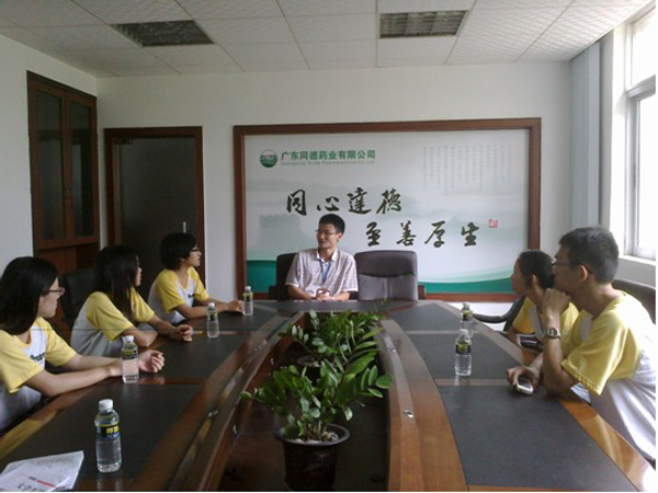 初到同德药业有限公司,09制药团支部全体成员在公司人事部白主管的带领下参观了药厂,并对药厂的整体环境和所设部门有了一个初步认识。接着,药厂销售部的王经理对该公司拥有的“好得快”、“人字”、“零距离”、“劲通”、“伊人净”等多个知名品牌给同学们一一作了详细的讲解,同学们也从中了解到了有关生产这些品牌药的原材料、成分药效及药用功能等知识。此外,同学们也了解到了我国药物生产与药物需求等方面的知识。王经理的详细介绍使同学们对本专业的药学知识真正从书本上的认识转变到生活中鲜明生动的认识,这也在一定程度上增加了同学们对制药行业的认识和增强了对专业的信心。