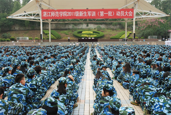 湛师新闻网10月8日讯 今天上午8点,我校在寸金广场举行了2011级新生军训(第一批)动员大会,学校党委刘海涛副书记,武装部林森部长、李海文副部长,91487部队承训官兵以及法政学院,商学院、教科院、人文院、化学院、音乐学院、美术学院的副书记、带队辅导员以及两千多名参训学生参加了本次大会。会议由李海文副部长主持。