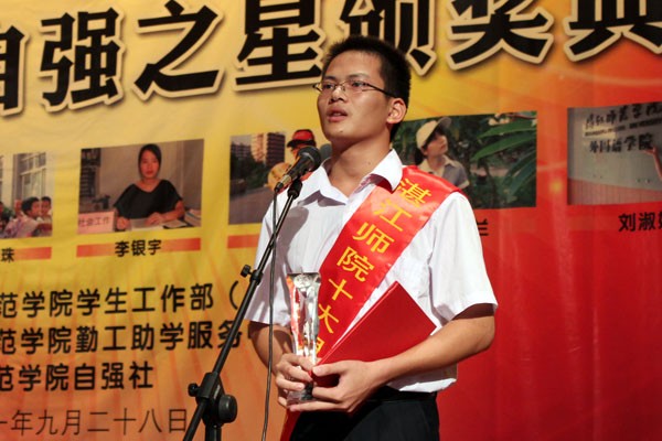 在谈到获奖感言的时候,潘粤金说道:“一直以来,家里的经济状况都不太好,但我从来没有去埋怨过现实,反而更加坚定了我的决心,我要通过自己的努力去改变命运。我从没出过小城,但我的愿望就是接父母到大城市去住。今天在这里,我要感谢我的父母、领导老师对我一直以来的关爱。我相信命运,但绝不屈服于命运。在未来的道路上,努力地做到无愧于每个关心我的人。”潘粤金同学的事例打动了在场的每一个人,激励大家遇到困难时都要坚持下去,只要付出努力,就会获得成功。