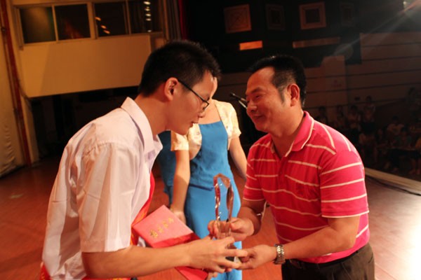谢应明书记为潘粤金同学颁奖。在的事迹DV回顾中,潘粤金同学说到自己从班长,到级长,再到学生会主席的华丽蜕变。虽然家境贫困,但他却从不自卑,早上一大早就起床在椰林晨读,中午放学后他还在学习,晚上就去做兼职。在大学两年里,他先后获得了二十多个奖项。他坚信,只有知识才能改变他一生的命运。