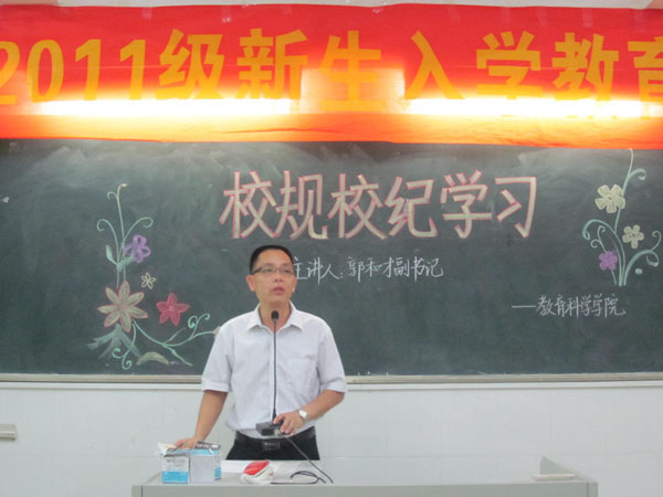 湛师新闻网9月28日讯 昨日,教科院于燕雷楼604室举行新生入学教育专题讲座第七场“校规校纪学习”暨新生军训动员大会。该院党委郭和才副书记、辅导员贾晶老师及2011级全体新生参加了会议。