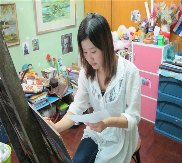 当笔者问道在泰国学习的两个月,面临最大的困难是什么时,她说:“那就是语言障碍了。对于泰语,我只会简单的生活用语。”她对自己不懂泰语很懊悔,因为上专业课时很难理解教授所说的内容,只能从画里领会。随后她笑笑说:“要是有个翻译在身边就好了!”