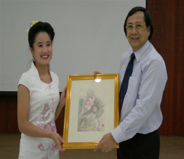 按照惯例,在学习结束时,美术系的交流生都会给校长一幅肖像画。苗翠华,想出了一个更好的主意——给校长画幅中国国画。她在泰国的那段日子,深切体验到泰国的信佛文化,于是她精心的画了一幅“疏影横斜、暗香浮动”般的莲花图送给校长,校长充满惊喜地收下了这份礼物。