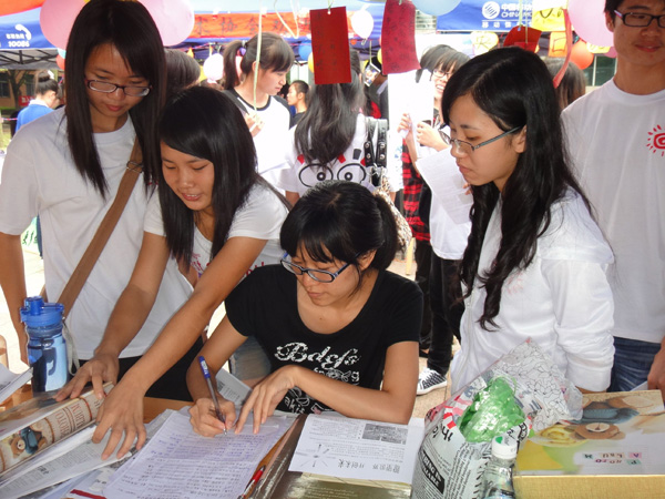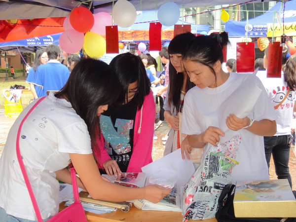 在周边挂满趣味小灯谜卡片的大本营现场,理事们个个精神抖擞,不断向路过的新生们介绍学社,耐心为新生解答各种疑问。看,他们有的在猜灯谜,有的在看社报,有的在翻看社团相片,还有的在看DV展示片!他们相互之间的互动,形成了一道亮丽的风景线。