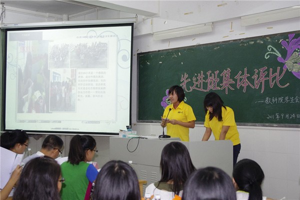 主持人介绍了出场嘉宾、评委等,对会议要点进行说明之后,评优正式开始。参赛班级包括09小英、09小数、09小语、10小英、10小数、10小语、08心本及10心本等8个班级。参赛班级代表各显千秋,以班子建设、班风建设、学风建设三方面为核心,满怀激情地用精彩的自制视频、幻灯片等形式介绍了各自的班级风貌。各班丰富多彩的活动、团结一致的凝聚力的展示使在场的观众深感震撼,充满激情,更赢得了一阵又一阵热烈的掌声。各班代表解说结束之后,相关工作人员开始计分。最后,郭和才副书记对此次评比作总结。