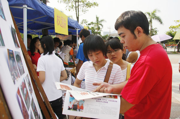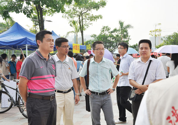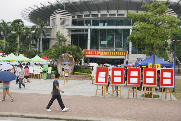 湛师新闻网9月20日讯 9月17日,我校四大学生机构在体育馆前举行2011年校级四大学生机构招新展示活动。校团委全体领导老师走访现场并指导各机构做好宣传招新工作。