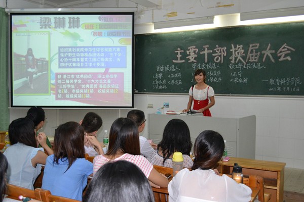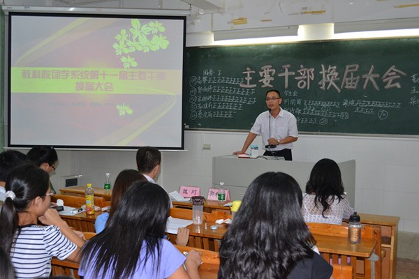 湛师新闻网9月20日讯 为切实加强学生工作的管理与完善,提高学生机构的内部工作效率,随着团学系统2011级新干招聘活动结束后,18日晚,教科院召开团学系统第十一届主要干部换届大会,参与大会竞选的机构分别是教科院团委、学生会和勤工部。该院党委郭和才副书记、辅导员魏珂、卢祖琴、贾晶老师出席了本次大会。