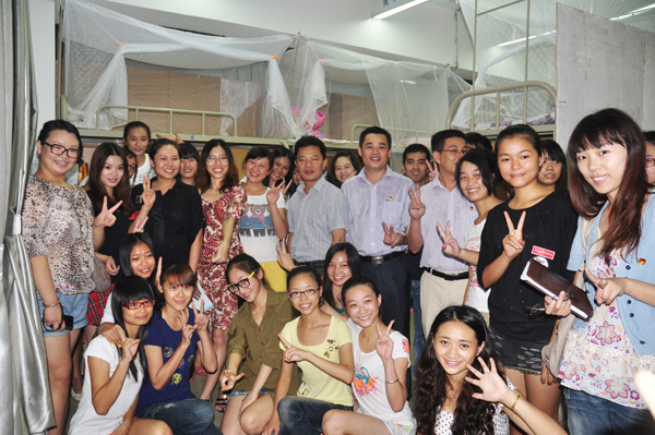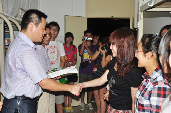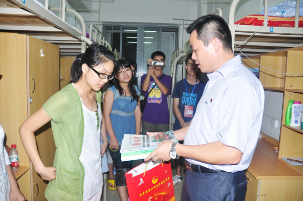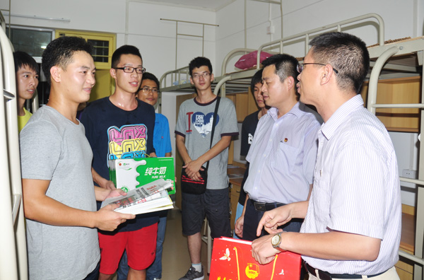 湛师新闻网9月15日讯 为了解新生入住宿舍的情况,使新生更快融入大学生活,9月13日晚,校团委李粤书记、李发武副书记带领校团委专职团干以及四大机构主要学生干部走访新生宿舍,与新生深情畅谈并为2011级新生送上书籍礼品等。
