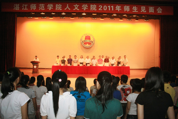 湛师新闻网9月14日讯 昨晚,人文学院在音乐厅召开了2011年师生见面会。出席本次见面会的有我校刘周堂副院长、人文学院熊家良院长、党委谢应明书记、人文学院王钦峰副院长、赵金钟副院长、刘惠卿副院长、党委冯基聪副书记、工会陈宗林主席、该院各系部主任、2011级各班班主任、2009级插班生班主任、辅导员老师及特邀嘉宾退休教师谭笑老师等。参加此次见面会的还有2011级全体新生及2009级插班生。会议由冯基聪副书记主持。