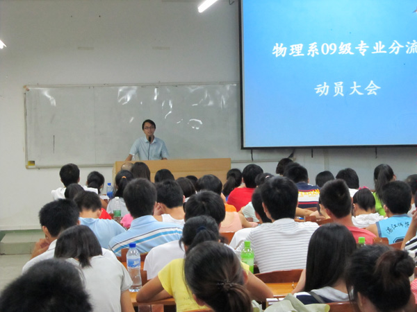 湛师新闻网9月11日讯 9日晚,物理学院在榕芳楼201室召开“物理系09级专业分流”动员大会。物理学院刘贵昂书记,薛书文主任、考研班班主任黄桦老师和周晓燕老师,以及09级物理学本科专业三个班全体学生参加了本次动员会议。本次会议由莫杰雄老师主持。
