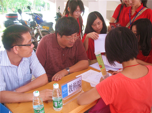 为了做好迎新生工作,教科院全体师生以饱满的热情,高昂的气势投入到工作中。该院张旭东院长、党委郭和才副书记和辅导员卢祖琴、魏珂、贾晶老师耐心地指挥着接待工作,为新生排忧解难,给学生和家长送来亲切的问候和关怀。教科院迎新人员秉着“热情、周到、负责”的工作态度,指引2011级新生办理各项相关的手续。搭载新生的车辆一到,负责接待新生的教科院干部便卖力大声叫喊学院名字,让新生们倍感亲切。新生们由师兄师姐带领到大本营,办理“一条龙”服务报到手续。干部们为新生和家长提供周到服务,耐心解答新生及家长的问题,引导新生完成报到手续;报到完毕,该院志愿者更主动帮助新生搬运行李,带领他们到宿舍入住。