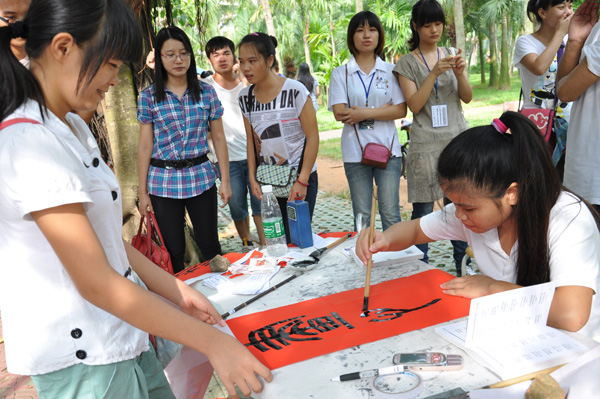 湛师新闻网9月11日讯 经过精心组织和周密安排,昨天,美术学院顺利迎接200多名新生报到入校。该院党委李爱群书记、林志军副书记、辅导员刘启红老师、黄钰晶老师来到大本营指导迎新工作。该院学生党支部、团委、学生会等学生机构、2011级助理班主任积极配合,主动协调,有条不紊开展接待工作。值得一提的是,为了让新生及家长及时了解我院的专业特色,现场还特意设置作品展示区,展示美术学子的优秀作品和扎实的基本功,此外,现场书写对联,新老生进行专业切磋,别开生面,在迎新现场营造浓厚的艺术氛围,吸引很多新生和家长纷纷驻足观看。