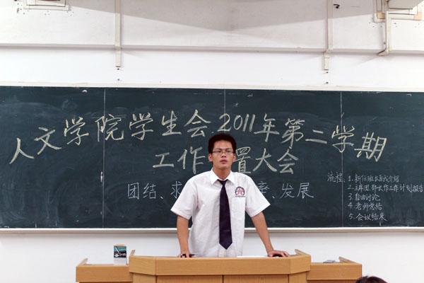 会议伊始,各班新任班长做了精彩的自我介绍。接着,人文学院学生会主席潘粤金对本学期做了工作计划报告,他围绕人文学院学生会“团结、求实、效率、发展”的工作理念,从“提高人文学子写作能力,营造良好的学习氛围、做学生的带头人,加强班级管理和各班班刊创建”等几个方面对学生干部和各班班长提出了要求。主席团的副主席和各部门部长也分别上台做本学期的工作计划,各部门之间有了更深的了解,有助于日后工作的顺利开展。