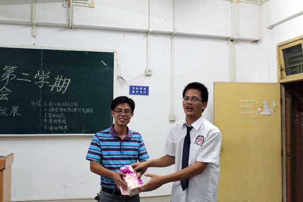 最后,人文学院学生会主席潘粤金代表人文学院全体学生会干部给张家波老师送上一份礼物,全体学生会成员发自内心的向张老师道一声:“老师您辛苦了!提前祝您教师节快乐!”会议在热烈的掌声中结束。
