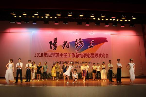 湛师新闻网9月5日讯 阳光路上,彩虹相伴。9月3日晚,由学生工作部(处)主办的“阳光路上”2010年助理班主任工作总结表彰暨联欢晚会在音乐厅隆重举行。学生处黄达海处长、赫云鹏副处长、钟丽萍副处长,思政部黎斌教授、外语院冯彩莲副书记、化学院钟明杰副书记、教科院李晓峰副教授等助理班主任培训班的授课老师出席晚会并担任颁奖嘉宾,各二级学院负责新生工作的辅导员及2010级、2011级全体助理班主任参加了晚会。