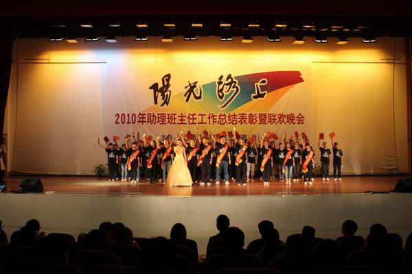 本次晚会既是一次工作总结表彰大会,更是新老助理班主任的联欢晚会。晚会从主持到演员基本都是由助理班主任担任,他们自编、自导、自演,用《感恩的心》、《爱,因为在心中》、《乘着歌声的翅膀》、《一个助班的日记》、《奉献》、集体走秀等节目完美地呈现了一年来助班队伍的辛苦付出和喜人成长。在独唱《阳光路上》激情动听的歌声中,全体获奖助班走上舞台,发出火热的青春宣言:2010阳光正好,2011年阳光将继续,新的精彩从这里开始。