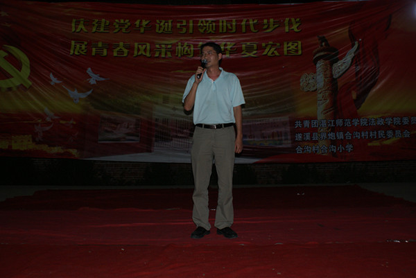 湛师新闻网7月29日讯 前天晚上,法政团委“三下乡”实践队在遂溪界炮镇河沟村文化广场举行以“庆建党华诞引领时代步伐,展青春风采构筑华夏宏图”为主题的文艺晚会暨湛江师范学院实践基地挂牌仪式以向民众展示当代大学生的良好精神风貌,向建党华诞献礼。节目精彩纷呈,现场人头攒动。法政院党委全柱副书记,北潭边防派出所肖所长、钟警官、朱警官,遂溪县界炮镇农村信用社袁主任,合沟村委班子,我校校友北谭初级中学校长、合沟小学全校长,法政学院莫智明辅导员、陈琳琳辅导员等嘉宾出席了晚会。