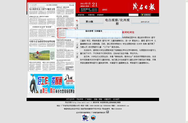 《茂名日报》以“湛师学子与留守儿童同吃同住”为题对“幸福北亨”实践队的关爱留守儿童活动进行了报道,日报写到,“湛师大学生志愿者来到了杨梅镇北亨村笔亨怀德学校,与那里的农村留守儿童结下对子,不仅和孩子同吃同住,还给他们送去书籍,带去欢乐。连日来,大学生们从实际出发,本着“锻炼自我,服务社会”目的地开展服务活动,在活动中实践着关注农村留守儿童的宗旨。他们通过对当地留守儿童生活学习情况进行调查、开展英语启蒙教育和留守儿童做游戏等,丰富留守儿童暑期生活,帮助留守儿童健康成长”。
