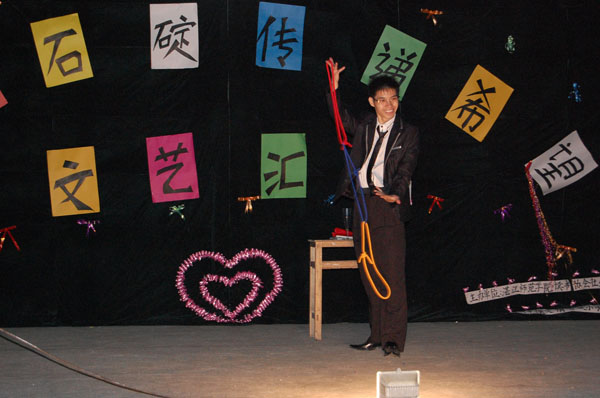 表演开始了,三年级6位可爱的孩子齐唱《兰花草》,纯洁,清脆的声音把大家都吸引住了。学生们还表演了舞蹈,手语,小品……实践队队员的精彩的魔术表演赢得了观众的阵阵喝彩与掌声,整个晚会的气氛到达了高潮。晚会上还有健美操,诗歌朗诵,口琴独奏,师生合唱。