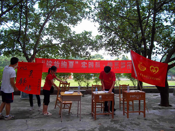 此前,“绽放绚夏”团队通过各种咨询平台了解到,由于各种因素,沉重的心理压力在不知不觉中渗入到校园纯真的学生群领域,给学生心理健康发展道路布满了障碍。为此,该实践队组织讨论开启“心灵驿站”,为学生提供一个倾诉与聆听的平台。在活动开展前,“绽放绚夏”队队员们群策群力,通过制作海报、书写书法、开设心理辅导课程等方式大力宣传,希望活动能顺利开展。