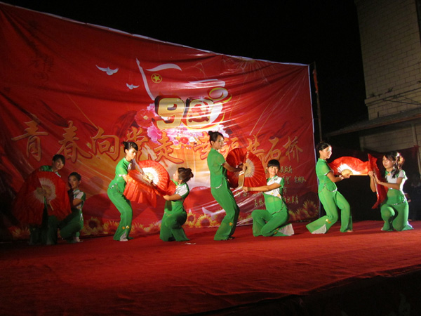 经过了前期的大力宣传,晚会受到了乡民们的热烈支持,台下座无虚席。 开场舞《大地飞歌》拉开了本次晚会的序幕,紧接着话剧《真爱永恒》,歌唱《映山江》等11个节目陆续上演。本次晚会的节目紧跟“红色”浪潮,以“青春向党走,幸福共石桥”为主题,节目丰富多彩,形式多样,涵盖舞蹈、话剧、歌唱、朗诵等。参与者除了“曦望”实践队队员,还有石桥镇社区健身队和石桥镇的学生。其中《活力啦啦操》尽显队员们青春有活力激情的一面,带动了台下的观众,把晚会推上了高潮;《荷塘月色》中优美的舞姿,动听的旋律,使观众陶醉其中。晚会过程中,掌声不断,乡亲们灿烂的笑容与高涨的热情,都是本次晚会成功举办的见证。