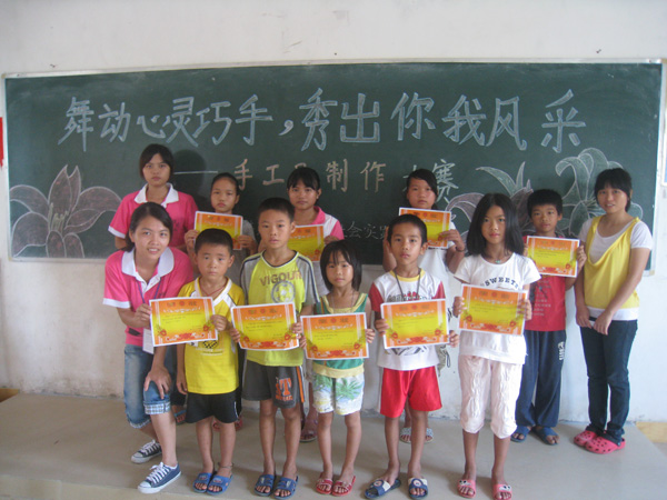 最后由该实践队的队员评出一等奖1名,二等奖2名,三等奖3名,多名优秀奖。该实践队队长为获奖选手颁奖。这次的手工制作大赛既锻炼了学生的动手能力,也让他们认识到如何利用身边的资源,让身边的垃圾变废为宝。