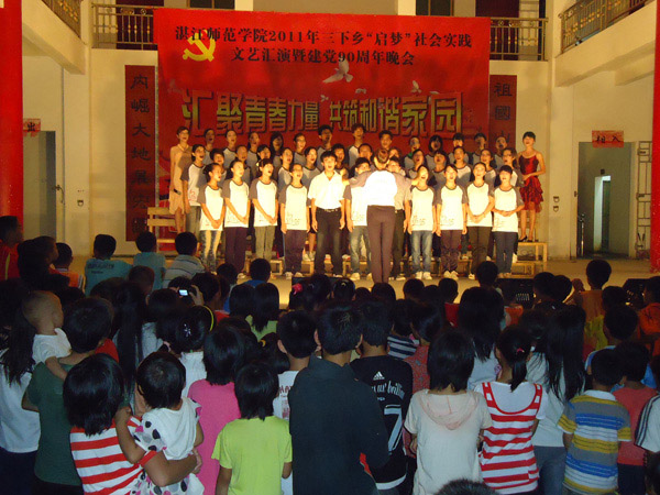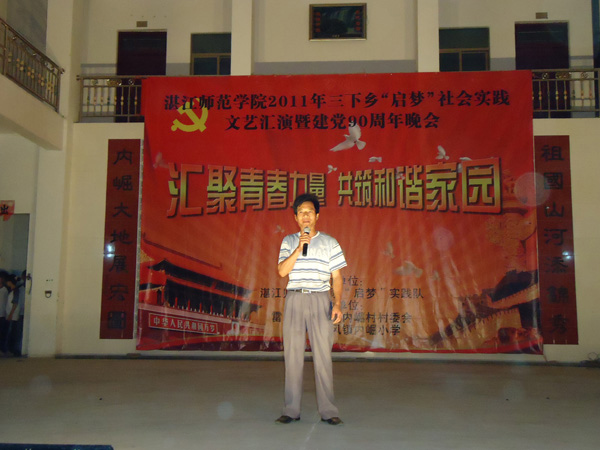 晚会是为了庆祝建党90周年,一首激昂的《歌唱祖国》唱响了“启梦”实践队全体队员对祖国的热爱,并把这份激情散播到内崛村的每个角落。晚会上,走秀《我型我秀》、手语《和你一样》、舞蹈《荷塘月色》等师生同台演出的节目展现了青春飞扬,活力四射的精神风貌,不仅得到领导的肯定,更是引起观众连连叫好。为了把更多的创新思想带到村庄,“启梦”实践队还精心准备了话剧表演《看病不再难》,这对于农村的村民来说,这是一个既新颖独特又耐人寻味的表演。它从另一个角度告诫人们要学会运用法律保障自身,不要被无良黑幕压制,得到了村民如雷般的掌声,引起晚会的高潮。晚会期间,内崛小学校长发表了讲话。他表示,“启梦”实践队这十天表现出色,让更多的孩子得到教育,这虽然是内崛小学首次进行的大学生社会实践活动,却表现得非常成功。此外,为了感谢内崛村对实践队的大力支持,晚上还设置了资金授予的环节,这引起了晚会的再一次高潮。一曲憧憬美好的《明天会更好》结束了晚会。