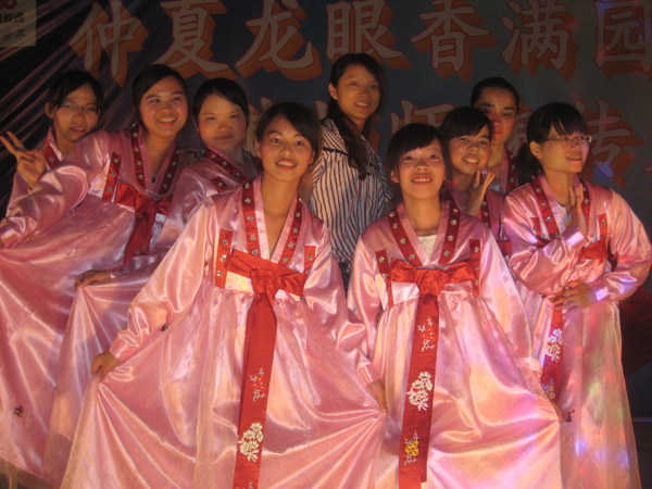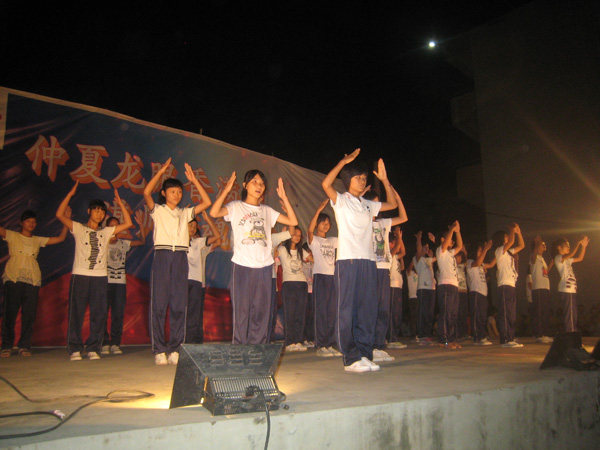 嘹亮的歌声划过宁静的夜晚,舞动的青春擦亮了天边的朵朵云。为期10天的“三下乡”将要接近尾声,“仲夏之约”实践队队员和龙眼中学的学生心中满载着激情和感动。一首首澎湃的歌曲抒发着队员们无限的感动;一支支灵动的舞蹈展现着队员们与学生的青春活力;一个个跳跃的音符划破夜空,让这个夜晚变得不平凡。一首缠绵的《雨夜花》合唱拉开了本次晚会的序幕,队员们精神抖擞,尽情地融入歌中的意境,淋漓尽致地展现其思想精髓。紧接着,感人的手语表演,充满活力的爵士舞、甩葱舞、极具教育意义的小品《其实你并不是丑小鸭》和充分体现中华文化的戏曲表演等节目轮番上演。其中,朗诵《以青春的名义宣誓》,队员们铿锵有力地呐喊着青春,引起了台下全体的共鸣,并引来了阵阵掌声。