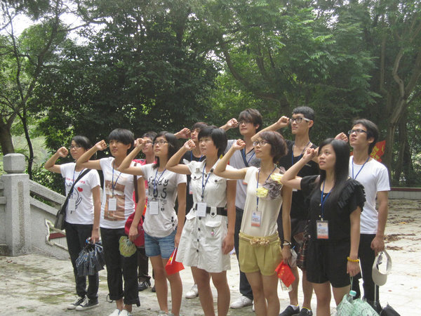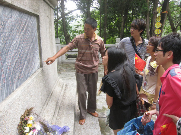 实践队成员在谢紹均委员的带领下首先参观了该村的伍家祠,祠内陈列着领村农民在新民主革命时期抗战时所用的物品以及记载着领村农民的抗战事迹。谢委员现场给大家当起了讲解员,他一边指着祠内的文物,一边给队员们进行讲解,队员们都听得津津乐道。随后实践队还参观了领村革命烈士陵园,缅怀革命先烈,学习英雄精神。谢绍均委员还给队员们详细讲解了碑文上的文字,复述先烈事迹。队员们还向先烈们献上了一首《把一切献给党》,以讴歌先烈们为国捐躯的伟大人格。