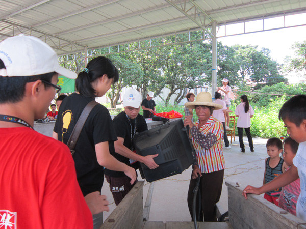 上午9点,活动在队员们的紧张筹备中正式开始。活动现场甚是热闹,冒着烈日赶来维修的村民络绎不绝。一位阿姨用手推车把家里坏掉的大电视机和风扇推过来了;一位叔叔骑着摩托车载着他家坏掉的大彩电过来了;一位老大妈拿着麻包袋装着她家4台坏掉的电风扇也过来了…….服务队的队员们热情的接待每一位前来维修的村民,耐心地为他们做好登记,并给他们送上凉茶,随即,维修队的技术员一一为他们进行检修。