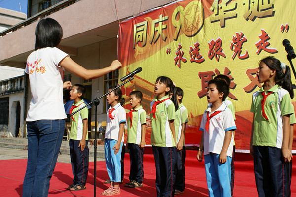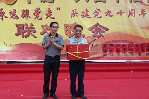 湛师新闻网7月23日讯 昨天下午,湛师教科院与广工轻化学院“红色先锋”实践队与湛江市文强书社在遂溪县黄略镇九东小学联合举行主题为“永远跟党走”庆祝建党90周年文艺汇演。原湛江市广播电视局局长、湛江市文强书社曲艺团团长成迪春,教科院党委郭和才副书记,九东村党委王国琼副书记,九东小学殷明光校长、王国强主任、王日平主任等出席了活动。