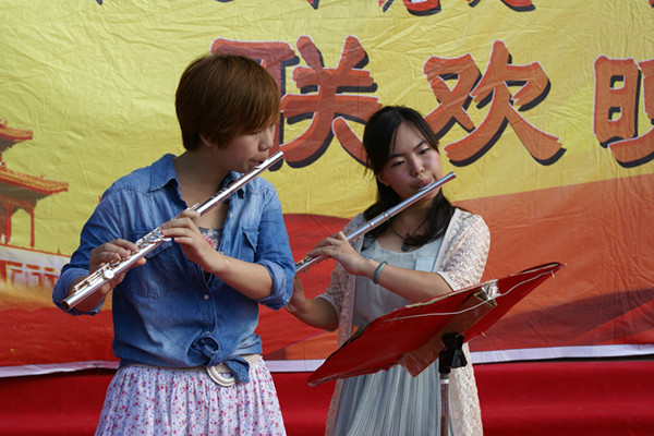 在郭和才副书记致辞后,“红色先锋”实践队和该校的学生们为大家表演了形式多样、富有特色的节目。实践队员表演的新疆维吾尔族舞蹈《阿拉木汗》、长笛二重唱《天空之城》,展现了大学生多才多艺、朝气蓬勃、奋发进取的精神风貌。九东小学学生们表演的红歌《歌唱祖国》、粤剧对唱《荔枝颂》、《新歌送伟人》、《花田错会》等,为汇演增添了不少文化气息。其中,在教学展示环节中,师生们共同展示了三下乡10天来的教学成果。有节奏欢快的啦啦操和蚊子舞,有充满古典文化和人文素养的青花瓷创作,还有具有创意的手工创作和富有动感的ABC Song等节目。