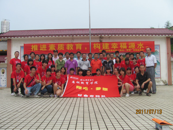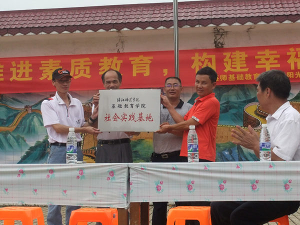 湛师新闻网7月14日讯 昨日,我校基础教育学院“阳光梦想”社会实践队在源水小学举行社会实践基地的挂牌仪式。基础教育学院领导、系领导、源水村村委会干部以及源水小学的全体师生都出席了挂牌仪式。
