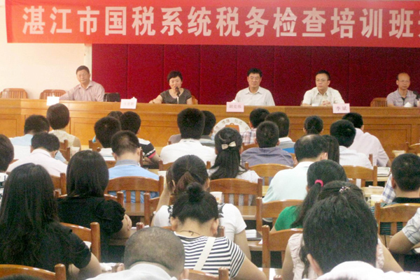 湛师新闻网7月6日讯 为提高湛江市国税系统税务干部职工的业务素质,增长干部职工的才干,培养一批骨干人才,湛江市国税系统与我校商学院共同举办了税务检查培训班。昨日,湛江市国税系统税务检查培训开班仪式在我校园府酒店三楼报告厅举行,湛江市国税局李斌副局长、我校校领导胡克伟同志、商学院王亚新院长、吴进书记、邬建平副院长、夏青副院长、会计系主任刘海英老师、李妍老师等参加本次培训的学员出席了开班仪式。