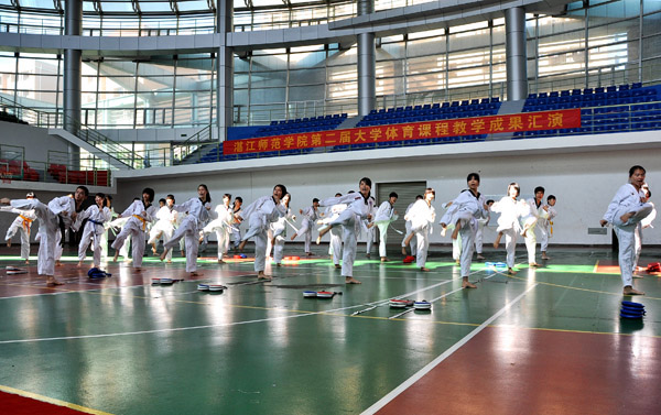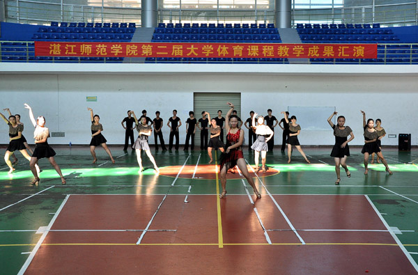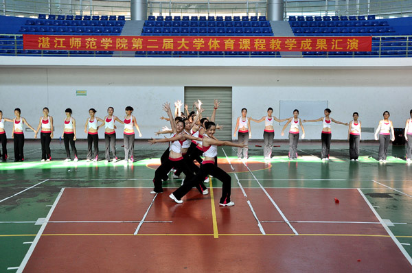 湛师新闻网7月3日讯 今天,由体科院公共体育部组织的第二届“大学体育课程教学成果”汇演在雷阳区体育训练馆举行。体科院章晓霜院长、曹巧书记、姚卫宇副院长、欧美珍副院长、公体部主任李刚以及公共体部全体教师出席了本次汇演活动。