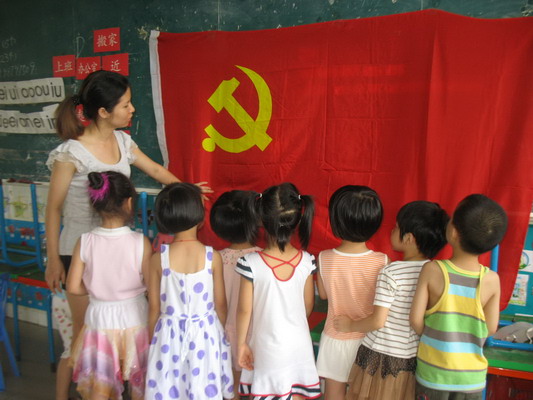 链接:为庆祝建党90周年这个伟大的日子,我校幼儿园在幼儿中开展学唱红歌、讲革命传统故事、亲手制作国旗等主题教育活动,各班以自己独特的方式来培养幼儿热爱党、热爱祖国的美好情怀。