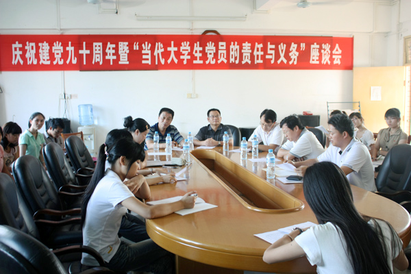 湛师新闻网6月28日讯 为庆祝建党九十周年,不断提高学生党员自身的责任意识,加强学生党员的先锋模范作用,我校机关党委教务处教工党支部与人文学院第二学生综合党支部在弘雷楼四楼会议室开展了主题为“当代大学生党员的责任与义务”的共建活动。我校教务处党支部张国祥书记、冯天学老师、李德深老师、高洪波老师和人文学院党委谢应明书记、第二学生党支部书记陈明辉老师及第二学生综合党支部全体党员参加了本次共建交流活动。