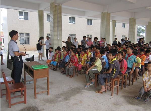 首先,在北亨小学多媒体教室开展家长动员大会。该服务队队长播放了我校2010年暑期三下乡社会实践活动总结宣传DV,让家长对我校三下乡活动有了初步了解,并通过PTT的形式向家长们介绍了服务队今年三下乡活动计划流程。
