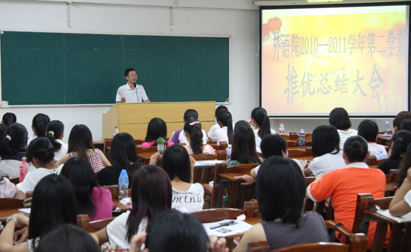湛师新闻网6月26日讯 昨晚,外语院在弘雷楼605室举行2010-2011学年第二学期推优总结大会。外语院团委杨进军老师、校团委组织部学生干部冯奕诗以及外国语学院团委组织部干部、各支部团支书及推优对象出席了本次大会。