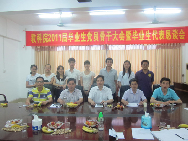 湛师新闻网6月24日讯 昨天下午,教科院在燕雷楼408会议室召开了2011届毕业生党员骨干大会暨毕业生代表恳谈会。校团委李粤书记、教科院党委王列盈书记、许占权副院长、郑剑虹副院长、郭和才副书记、辅导员魏珂老师以及07届的教本专业、心本专业和专升本专业的13位学生代表出席了会议。会议由郭和才副书记主持。