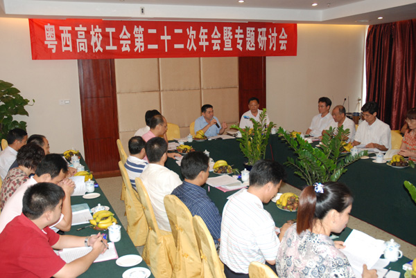 湛师新闻网6月19日讯 16日,由我校教育工会承办的粤西高校工会第二十二次年会暨2011年粤西高校工会工作专题研讨会在远洋城市酒店二楼城市厅举行。我校党委副书记、工会主席刘海涛,茂名职业技术学院党委副书记、纪委书记、工会主席林文琼,广东海洋大学、广东医学院、广东石油化工学院、五邑大学、肇庆学院、茂名职业技术学院、罗定职业技术学院、湛江师范学院、湛江师范学院基础教育学院,共9所高校的工会领导、工会干部、女工委负责人等41人参加了本次研讨会。