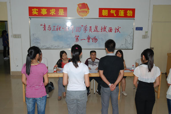 面试分三个面试会场进行,评委由校团委领导老师及校团委主要学生干部担任,每个考场均设5名评委,采用评委提问、学员候选人作答的方式进行。