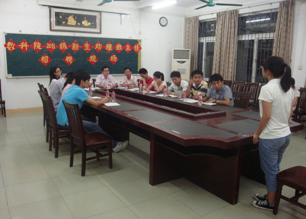 湛师新闻网6月19日讯 昨晚,数科院在榕燕楼教师会议室举行2011级新生助理班主任招聘会。数科院辅导员全光华、杨洁老师及2010级的各班助班担任本次招聘会的评委。