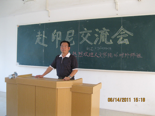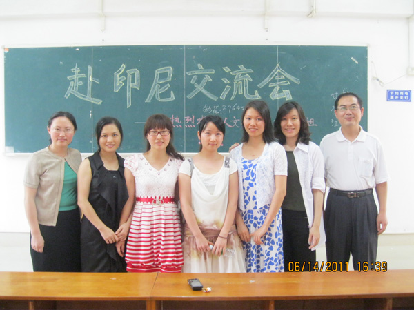 湛师新闻网6月18日讯 6月15日下午,人文学院在弘雷楼202教室举行赴印尼交流会。出席交流会的有人文学院党委谢应明书记、郑继娥老师、张鲁昌老师、印尼语教师蔡秉擁老师以及从印尼支教回来的人文学院06级对外汉语专业的甘楠、李素敏、江鈺鈺和符彩花四位同学。交流会由谢应明书记主持。