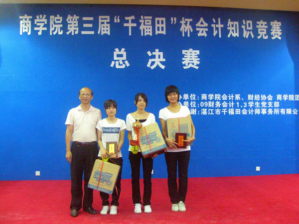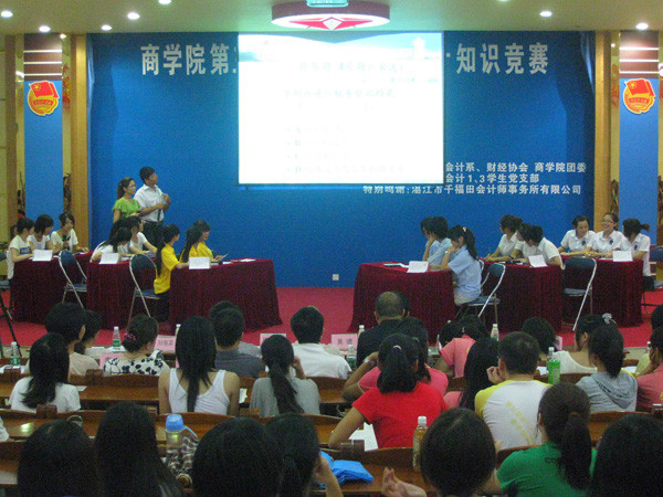 湛师新闻网6月15日讯 6月11日,由商学院会计系、商学院团委和财经协会主办,09财务会计1、3班学生党支部协办的第三届“千福田”杯会计知识竞赛总决赛在弘雷楼311室举行。商学院党委吴进书记、副院长邬建平、梁晋副书记、会计系主任刘海英以及辅导员张彦、李春霞等到场观看了比赛。