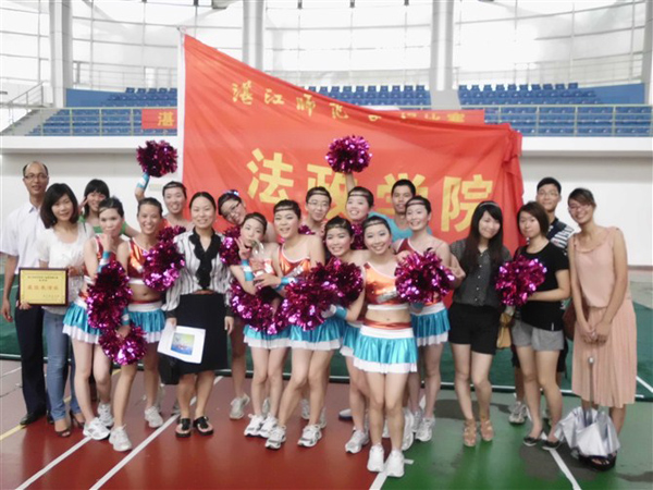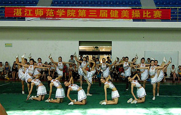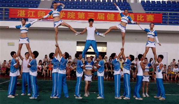 赛场上,有商学院活力四射的精英群体,外国语充满青春美丽的演绎,音乐学院展翅舞动的飞翔,教科院敢于梦想的精彩,法政院绚烂夺目的光芒,物理院的“律动人生,青春一生。”的神采,数科院再创辉煌的自信,人文院健康与美丽的舞台,信科院超越极限的飞跃,生科院酣畅淋漓的挥洒。各学院,各代表队在舞台上风格不同,敢于挑战高难度,在观众一次又一次的欢呼中,各拉拉队的鼓励与呐喊中飞越极限,展示了大学生的风采。